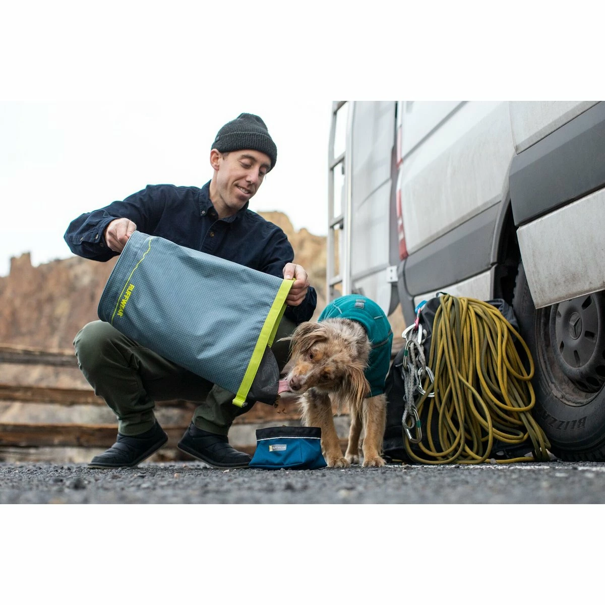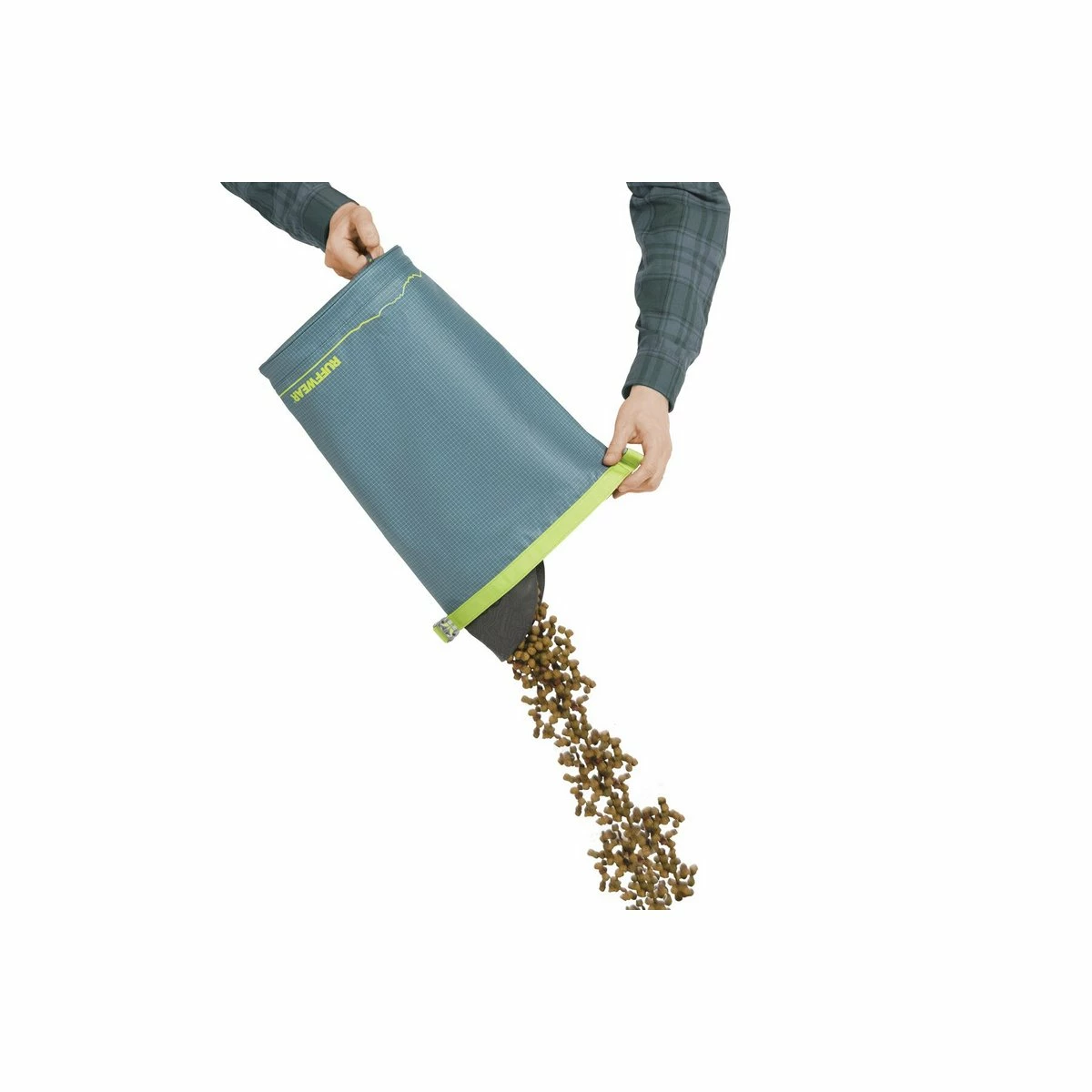 The Kibble Kaddie is a travel-friendly dog food carrier. A compact, convenient design allows for easy transport, storage, and dispensing of kibble whether at home, on the road, or at camp. The top-loading, roll-down closure secures contents (from spills and curious noses) and reduces volume of the bag as food is consumed. Dispense kibble through a fold-out spout at the top, and stash collapsible bowls and other food items in a separate internal compartment.