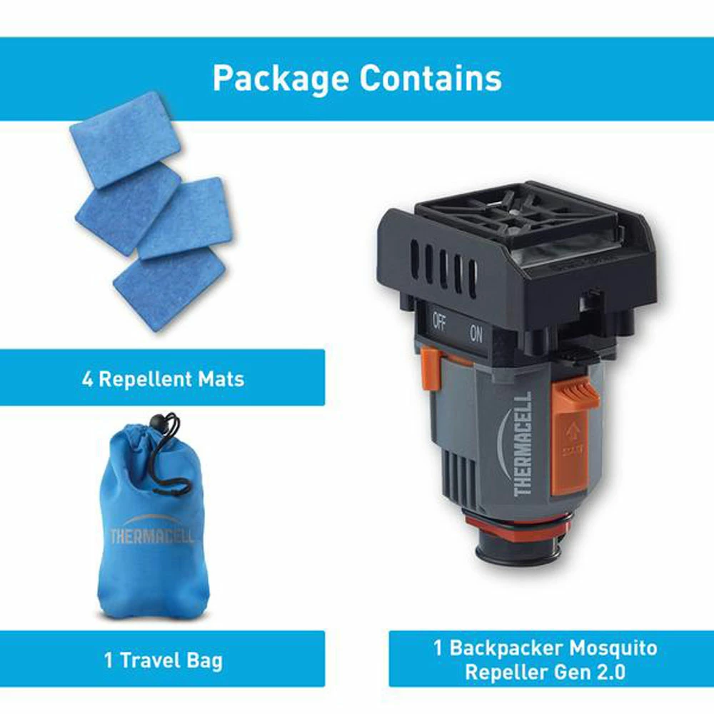 • Package contains: 1 Backpacker Repeller, 16 hours of repellent (4 repellent mats lasting 4 hours each), and 1 water-resistant travel bag. Requires camping gas canister (not included)